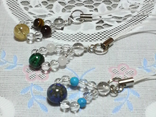 天然石ストラップ 輪っかタイプ 基本的に10mm玉をメインに、輪っかになるようにいくつかの石で構成されてます。 色や石の種類はバラバラです。 当サイトで使用している天然石一覧表 サンプル画像 スモーキークォーツメイン カーネリアンメイン アメジストメイン 上からシトリン、マラカイト、ラピスラズリメイン